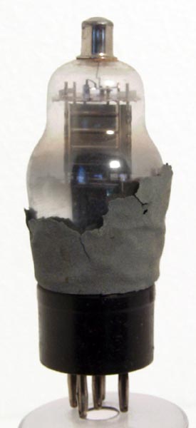 |  | The HD24 is a directly heated double diode triode that would have been used in broadcast receivers, as detector, AGC detector and first audio amplifier. The metal paint is flaking off of the glass leaving little residue of the adhesive. Our other HD24 was made for the consumer market and has a plain envelope.The HD24 has a lower filament consumption than the HD23 which itself was designed to lower the filament consumption and thus replace the HD21 and/or HD22. The HD24 has a lowest anode current rating of the series.The classic envelope is 40 mm in diameter and, excluding the B5 base pins, is 98 mm tall.References: Data-sheet, 1040 & 1043. Type HD24 was first introduced in 1939. See also 1939  adverts. |
