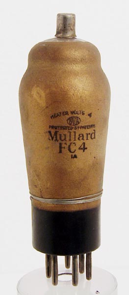 The FC4 from Mullard was the first British produced Octode. It was first made commercially in 1934.The FC4 is a self oscillating mixer for frequency changing in radio superhet receivers. The oscillator has to generate 12 Volts peak to peak for correct operation. It would typically have used a 90 Volt oscillator anode voltage and up to 2.0 mA anode current. The oscillator would use g1 as control grid and g2 as anode. Of the six grids the final one was a suppressor, g3 and g5 would be screen grids, and the signal would be applied to g4, hence its position as top cap connection.The classic envelope is 44 mm in diameter and, excluding the B7 base pins, is 112 mm tall.References: Data-sheet, 4024 & 1043. Type FC4 was first introduced in 1934. See also 1934 adverts. |
