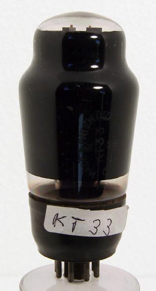 The KT33 audio power output valve was introduced in 1937 and was replaced by the KT33C in 1939 and that had a heater centre tap. Electrically the two were identical.For the 5 Watts output the anode load would be 3,000 Ohms. The distortion at full power was not quoted.The mutual conductance is given as 10, this suggests a very small gap between the cathode and the control grid, in turn implying very tight manufacturing tolerances.The classic envelope is 48 mm in diameter and, excluding the IO base pins, is 97 mm tall.References: Data-sheet & 1043. Type KT33 was first introduced in 1938. See also 1938 adverts. |