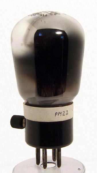 The filament and anode voltages are printed onto the top of the envelope together with the type designation.The anode load impedance required is 8,000 Ohms.Additional details can be found on this second data-sheet.Both four and five pin versions were made, the connections given are for the five pin version.The balloon envelope is 47 mm in diameter and, excluding the B4 base pins, is 88 mm tall.References: 1931 data-sheet & 1043. Type PM22 was first introduced in 1928. See also 1928 adverts. |