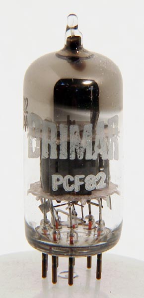 The PCF82 is a television frequency changer from the VHF television era. Each section has its own cathode brought out to a pin. The pentode voltage rating is higher than the PCF80.The thin glass tube envelope is 20 mm in diameter and, excluding the B9A base pins, is 48 mm tall.References: Data-sheet & 1040. Type PCF82 was first introduced in 1953. See also 1953 adverts. |
