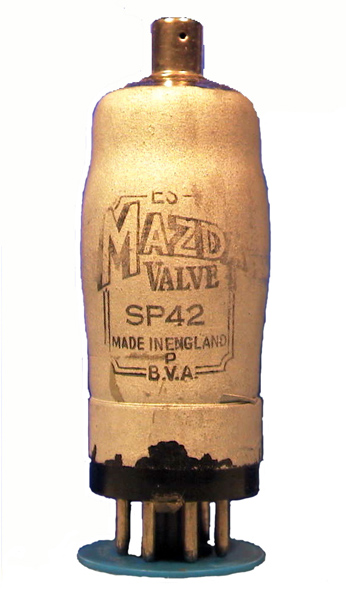 |  | The SP42 is an HF pentode for use in the video output stage in early television receivers.Thanks to Leif Ekornrxd (LA9IM) for the picture. Click here for Leif's site.The classic envelope is 32 mm in diameter, and excluding the MO base pins is 76 mm tall.References: Data-sheet, 1040 & 1043. Type SP42 was first introduced in 1938. See also 1938  adverts. |