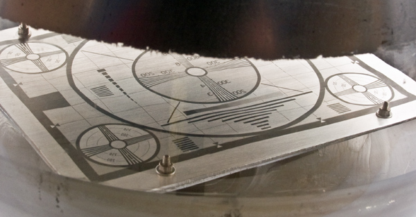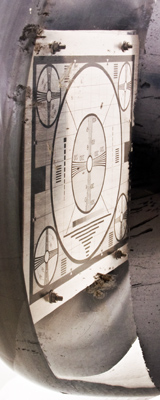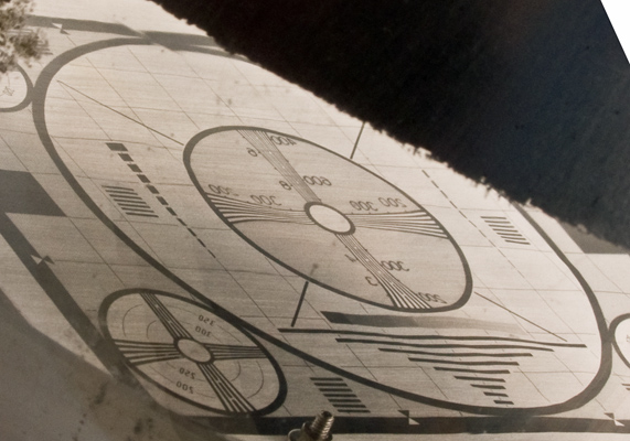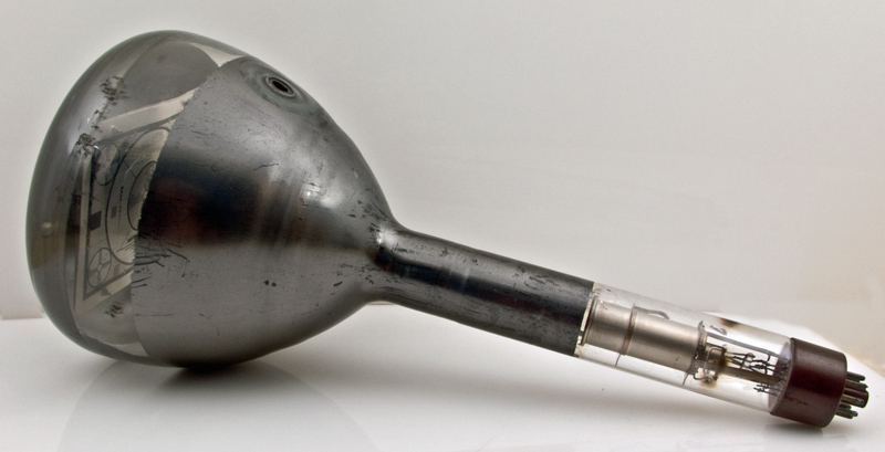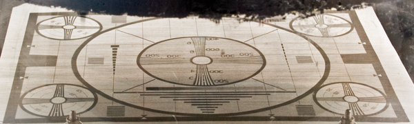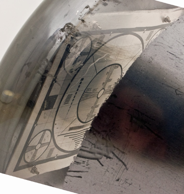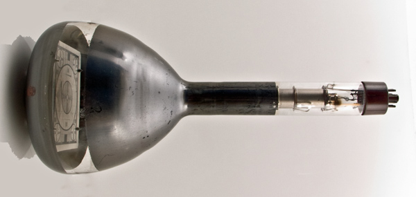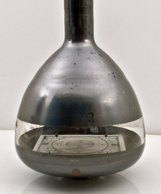 This exhibit is a monoscope tube for generating a television test card. The pattern is close to the Indian Head design introduced in America in 1938 but does not actually feature the Indian Head design.