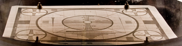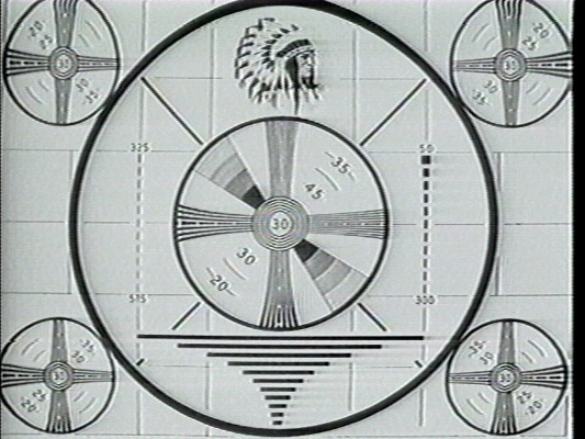 The Monoscope uses a standard magnetic deflection CRT design to produce a scanning beam of electrons but in place of a fluorescent screen the faceplate connects to a metal plate inside the tube. This plate has an insulated photographic pattern engraved upon it. The scanning beam produces an output where it strikes the plate and no current where it strikes the insulation. This arrangement produces a stable image and was much more cost effective than having a camera pointed at a printed test card. It was, of course, limited to a single design. Additionally it was a monochrome only technology and its use ceased with the advent of colour television.