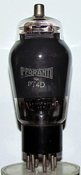The PT4D is a directly heated double diode output pentode. The PT4 was originally designed for when a directly heated valve was required and had slightly less output than the MPT4.The cathode resistor is given as 150 Ω and the anode load is 6,500 Ω.Thanks to Bob Hopkins for sending the image.The classic envelope is mm in diameter and, excluding the B7 base pins, is mm tall.References: Data-sheet & 1043. Type PT4D was first introduced in 1934. See also 1934 adverts. |