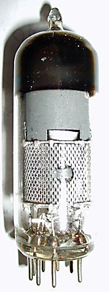 The EF80 internally screened pentode was a workhorse of the VHF TV receiver and was introduced in 1950. It was described by Mullard as: a high slope RF pentode and not a variable μ type. The EF85 was the variable μ counterpart to the EF80.The EF80 was much used for RF, intermediate frequency, and video amplification.Thanks to Jonathan Marsh for sending the image of this early EF80.The thin glass tube envelope is 19 mm diameter and excluding the B9A base pins, is 59 mm tall.References: Data-sheet & 1040. Type EF80 was first introduced in 1950. See also 1950 adverts. |