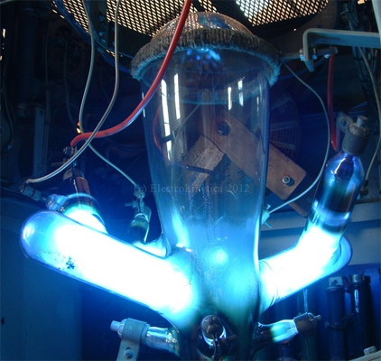 The base showing the mercury pool and the cathode connection on the left. The smaller electrodes are the starting anodes. The coils below them are the solenoids that attract the flexible arm of the starting anode. With the solenoids energised the flexible arm will vibrate at mains frequency and periodically touch the mercury causing a small patch of ions. In time when sufficient mercury has ionised these ions reach the main anodes and the full arc strikes.Thanks to Mario Maqana Canteli for sending these pictures.The balloon envelope is mm in diameter, and excluding the base pins is mm tall.Reference: Data-sheet. |
