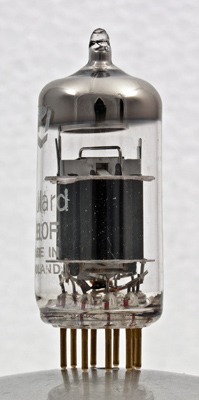 The anode side view.The thin glass tube envelope is 20 mm in diameter, and excluding the B9A base pins, is 47 mm tall.References: Data-sheet & 1040. Type E810F was first introduced in 1958. See also 1958 adverts. |
