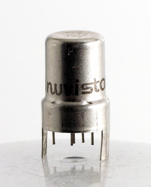 The picture above shows the special twelvar base.The Nuvistor is built as a series of co-axial electrodes but they are all very small, and small inter electrode capacitances result. Thus the high frequency of operation. Unlike the transistors of the time the Nuvistor had the overload and intermodulation characteristics of the valve, superior to the transistor.The thin metal tube envelope is 9 mm in diameter (10 mm maximum), and excluding the base pins, is 20 mm tall. The pins are protected by the extended case, that also acts as a guide into the base for the fragile pins.Reference: Data-sheet. Type 7895 was first introduced in 1961. See also 1961 adverts. |