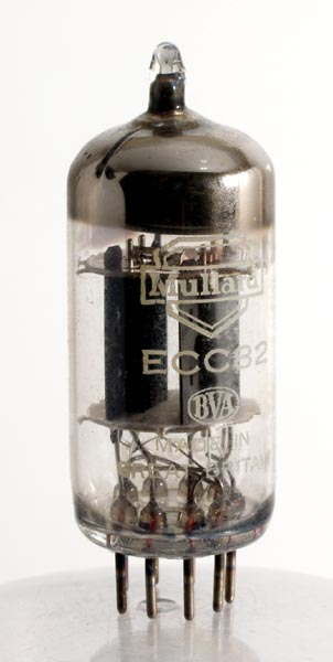 This exhibit is the Mullard ECC82. Designed as audio and general purpose triodes, two independent valves exist in the envelope. Each half is sensibly equivalent to one EC90 triode.An amplification factor of 17 is quoted, which is much lower than that for the pin compatible ECC83 at 100.In television receivers the ECC82 was used as frame and line timebase multi-vibrators, AGC circuits and driver stages. It was as multi-vibrators that faults would most often develop.