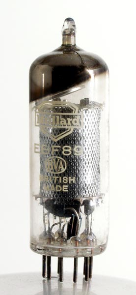 The EBF89 features two signal diodes and a variable μ pentode in the one envelope and sharing a common cathode. The diode anodes are small plates placed either side of an extended cathode tube.The variable μ characteristic is indicative of a device designed to have its gain controlled by an AGC system. This places this valve in service as a final IF amplifier and detector. Or with a separate detector the two diodes can provide a delayed AGC voltage. This would give full amplification until a threshold is reached. The high impedance of the pentode supports the case for use with a tuned circuit connected to the anode.The thin glass tube envelope is 20 mm in diameter and excluding the B9A base pins the valve is 57 mm tall.References: Data-sheet & 1040. Type EBF89 was first introduced in 1954. See also 1954 adverts. |