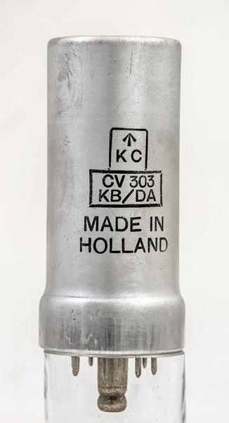 The CV303 is the UK government designation for the commercial EF22 and is an example of an all glass construction amplifier pentode. In this valve the whole envelope is encased in a screening aluminium can.The KB/DA identifies this valve as being made to specification K1001 or K1006, the B denotes qualification by a UK authority and the DA identifies the maker as Mullard Radio Valve Co., Blackburn.