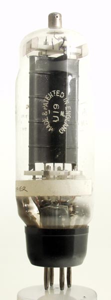 The U19 high voltage half wave rectifier was designed to have an effective series resistance of 600 Ohms and to feed a reservoir capacitor of not more than 4 µF.This exhibit is ruggedly constructed with ceramic supports and insulators. The anode is carbonised to aid in radiating away the heat generated in use by the intense electron bombardment.The wide glass tube envelope is 48 mm in diameter and excluding the B4 base pins it is 157 mm tall.Reference: Data-sheet. Type U19 was first introduced in 1947. See also 1947 adverts. |