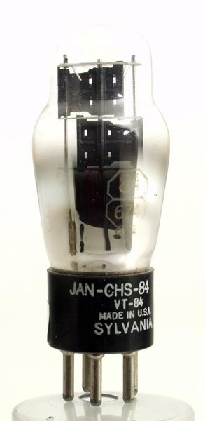 The 6Z4 is also marked as type 84 and VT-84. It is a low power indirectly heated full wave rectifier with a common cathode tube that runs vertically through both pressed anode cavities.The classic envelope is 36 mm in diameter and, excluding the UX5 base pins, is 89 mm tall.References: Data-sheet, 1040 & 1043. Type 6Z4 was first introduced in 1937. See also 1937 adverts. |