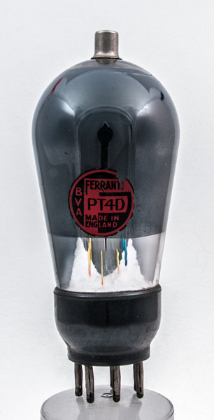 The electrodes within the balloon envelope are held in place only at the pinch. The later classic envelope version PT4D uses the shoulder of the envelope to hold a mica disc and thus the electrodes are held at the top as well as the base.The balloon envelope is 56 mm in diameter and, excluding the B7 base pins, is 124 mm tall.References: Data-sheet & 1043. Type PT4D was first introduced in 1934. See also 1934 adverts. |
