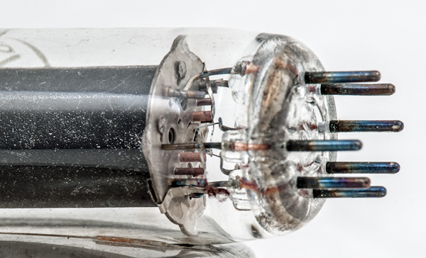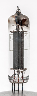 The base end. The cathode can be seen to have flat sides and the heater passes six times through it. Both inner grids are wound on copper supports.