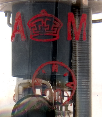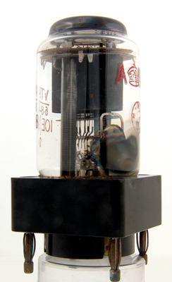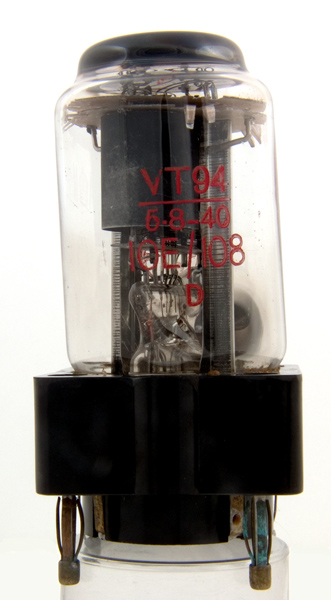 The VT94 is a medium power RF triode designed for HF service up to 6 MHz. The carbonised anode is held in place by two T shaped supports. These supports fit to a circular band that fits around the pinch and is held in place by a nut and bolt. Clearly a hand assembled valve. At the top of the envelope is a reduced diameter section to the envelope. The top mica locates in this part of the envelope to give added mechanical stability.