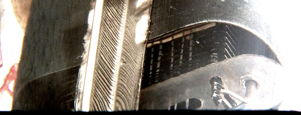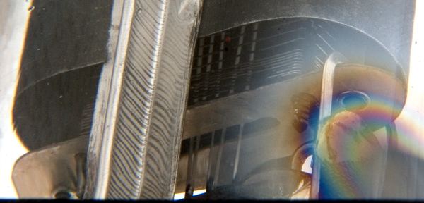This oblique look into the anode space shows the filament loops and substantial wire forming the grid. The T shaped anode support is also clearly seen.
