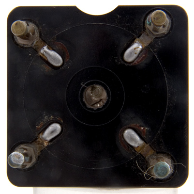 The L4 base seen full on. The connections can be seen to be made to brass shim that connects to the sprung pins that are themselves securely attached to the composition base. The L4 base is 56 mm square and 25 mm thick. The locating circle at the base of the moulding is 43 mm in diameter and 11 mm thick.