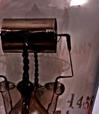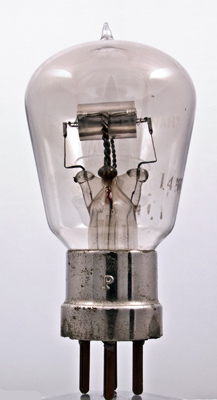 A close-up of the inner structure. The filament is much thicker wire than the receiving types. This is to allow for greater heating current and thus greater anode current. These early transmitting valves employed anode voltages up to 1,000 Volts.