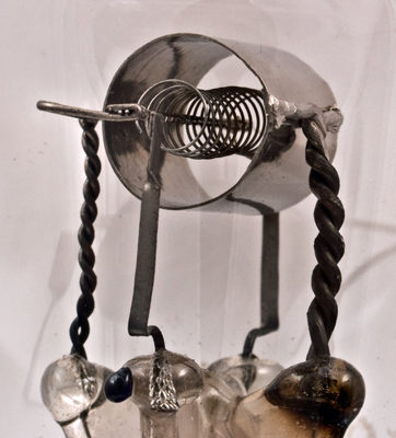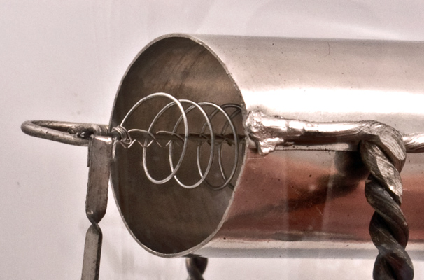 This view shows the top of the filament in the centre and on the right, within the anode, can be seen the grid helix fixed to the two horizontal supports by a wire that binds the grid to the supports. The supports themselves are held to the main support by being clamped.
