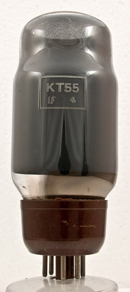 The KT55 is a post-war low HT variant of the KT66 designed for universal (AC/DC) equipment where the absence of an HT transformer would limit the HT available to 200 to 230 Volts and employ a half wave rectifier. The heater is a 300 mA type and to deal with the low HT and thus corresponding greater HT current requirement generates greater heat than the KT66. Cooling of the envelope is therefore often required. In fact the KT66 has an 8 Watt heater and the KT55 consumes 15.6 Watts.