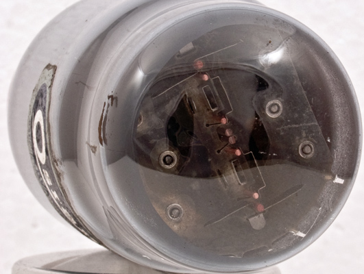 Looking into the dome one can see the top mica and the tops of the electrodes. There are two cathodes, two sets of control grids with heat sink fins attached and two sets of screen grid supports. The beam confining plates are a single set placed outside the screen grid outer rods. The reason for the high heater Wattage now becomes clear, to achieve the high current low voltage performance needs twice the cathode area.