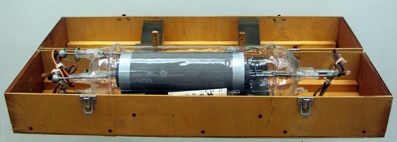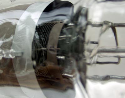 The TYS5-3000 is directly heated with a thoriated tungsten filament. The top of the grid cylinder is visible as is the grid spiral emerging from the left of the top ring. The outer cylinder is the nickel anode.