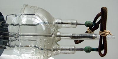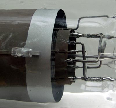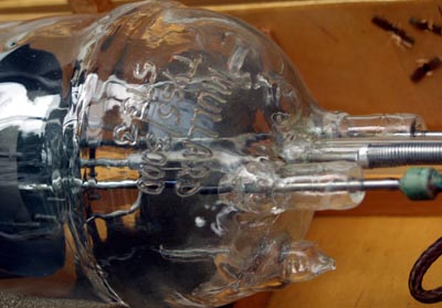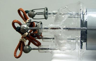 Looking through the envelope the distorted image of the electrodes shows the ripples in the diffiicult to make silica envelope.