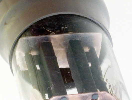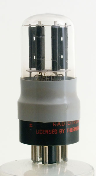 This device uses a miniature pinch as does the Tung-Sol 6SN7GT. In fact the top mica support is the main difference between them. Under magnification the pinch looks the same for both valves.The wide glass tube envelope is 27 mm in diameter and, excluding the IO base pins, is 66 mm tall.References: Data-sheet, 3002 & 1040. Type 6SN7GT was first introduced in 1941. See also 1941 adverts. |