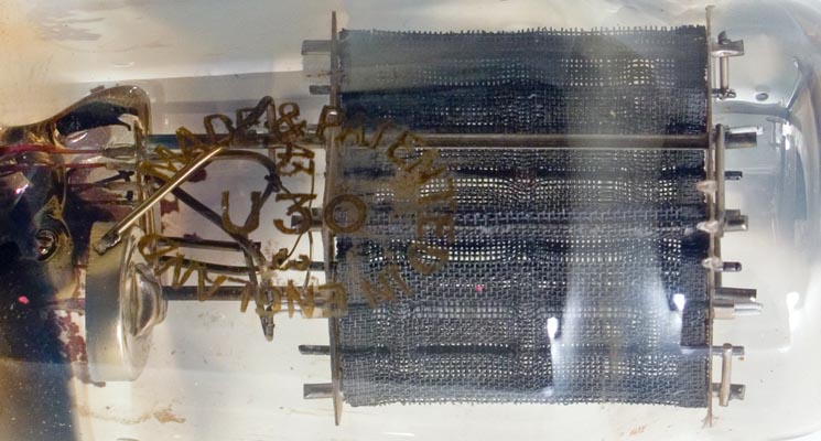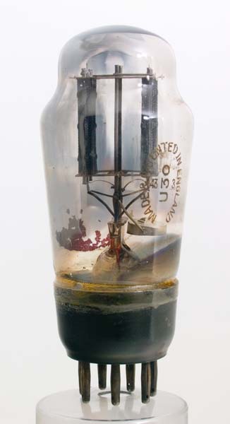 The typical M-OV type stamp is seen on the envelope. Within can be clearly seen the mesh anode with the cathode inside. the getter and pinch are on the left.The classic envelope is 47 mm in diameter and, excluding the B7 base pins, is 105 mm tall.References: Data-sheet & 1043. Type U30 was first introduced in 1934. See also 1934 adverts. |