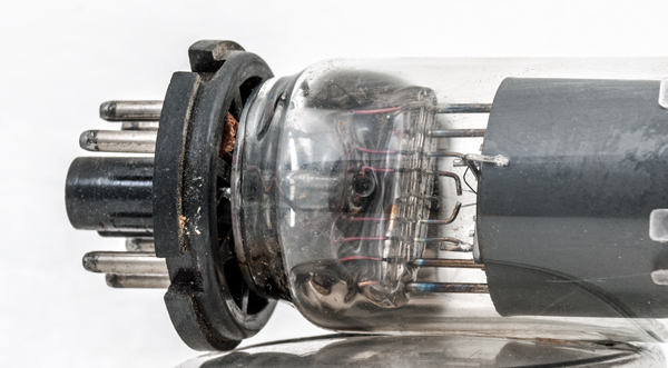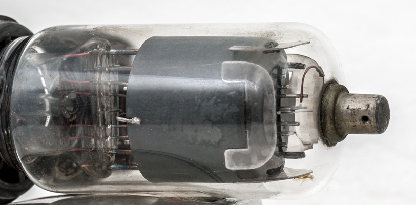 The top of the envelope: the control grid connects to the top cap. The cathode has three loops of heater within it.