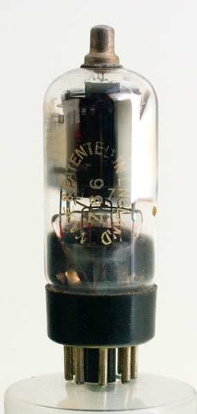 The three wire grids can be made out within the anode cavity.The wide glass tube envelope is 28 mm in diameter and, excluding the IO base pins, is 78 mm tall.References: 1040 & 1043. Type Z66 was first introduced in 1948. See also 1948  adverts. |