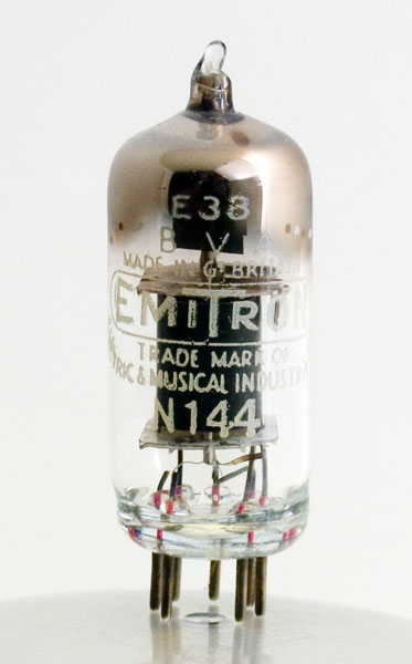 Emitron is not a usual trade mark.The thin glass tube envelope is 17 mm in diameter and, excluding the B7G base pins, is 44 mm tall.References: Data-sheet & 1040. |