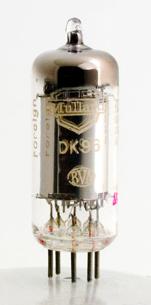 This Mullard DK96 is labelled as of Foreign origin and comes from the time that Mullard production in the UK was in decline. From the early 1960s battery valve radios lost out to the imported transistor radio. In 1964 a six transistor miniature radio operating on a PP3 battery could be purchased for little more than a 90 Volt HT battery.The DK96 dry battery frequency changer from Mullard is from the later range of very low filament consumption valves.The thin glass tube envelope is 17 mm in diameter and, excluding the B7G base pins, is 46 mm tall.References: Data-sheet & 1040. Type DK96 was first introduced in 1953. See also 1953 adverts. |