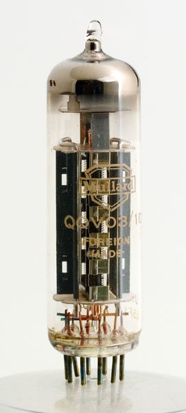 The QQV03-10 is a Mullard design and follows the European pattern of a central common core and two spaced anodes finned for greater heat sinking.This valve type was much used for mobile VHF transmitters, as well as drivers for the larger power valves. such as the QQV06-40A.In keeping with the Mullard practice the heater is centre tapped to enable operation from 12.6 volts as well as the normal 6.3V, thus making them directly suitable for operation from vehicle batteries.See also CV2798 for detailed pictures of the electrodes.The thin glass tube envelope is 20 mm in diameter and, excluding the B9A base pins, is 70 mm tall.References: Data-sheet & 1040. Type QQV03-10 was first introduced in 1955. See also 1955 adverts. |