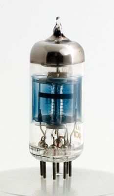 The electrodes fill the width of the valve. The anode is formed by two rectangular plates at either side of the valve. The other two sides of the box being completely open. All three grids can be clearly seen.The thin glass tube envelope is 17 mm in diameter and, excluding the B7G base pins, is 46 mm tall.References: Data-sheet & 1040 Type EF91 was first introduced in 1947. See also 1947 adverts. |
