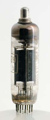 From the first picture the ceramic insulators and substantial cathode tube diameter can be seen. The second picture shows the valve from the side.The thin glass tube envelope is 19 mm in diameter and excluding the B9A base pins the length is 71 mm.References: Data-sheet & 1040 |