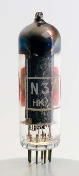 | | The N37 is a television type audio output pentode.The load impedance is 6000 Ohms and the cathode resistor is 330 Ohms. At 10% total harmonic distortion the valve can produce 2.3 watts of audio.