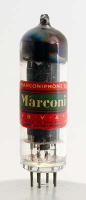 The red Marconi label covers most of the envelope circumference.The thin glass tube envelope is 17 mm in diameter and, excluding the B7G base pins, is 58 mm tall.References: Data-sheet & 1040. |