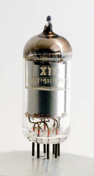 |  | The X18 is a battery heptode frequency changer or mixer. It was designed for AM broadcast radio reception on the short, medium and long wave bands.The oscillator feed needs to 15 volts pk-pk.The thin glass tube envelope is 20 mm in diameter and, excluding the B7G base pins, is 47 mm tall.References: Data-sheet. Type X18 was first introduced in 1954. See also 1954  adverts. |