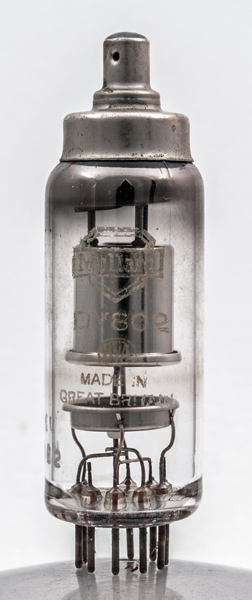 The lower screen connects to pin one as can be seen in the foreground of the image. The oxide coated cathode tube is central in the anode bell.The thin glass tube envelope is 22 mm in diameter and, excluding the B9A base pins, is 65 mm tall.Reference: Data-sheet. Type DY802 was first introduced in 1965. See also 1965 adverts. |