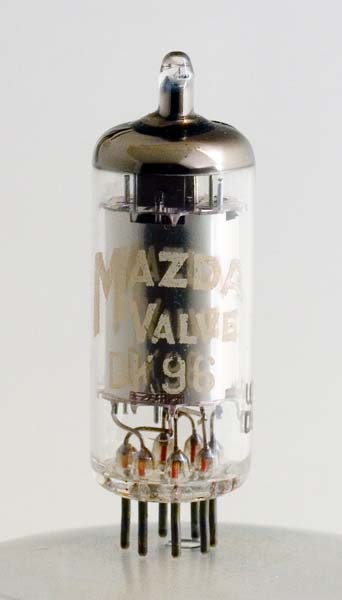 This DK96 exhibit is from Mazda and the envelope is labelled as foreign made. From the early 1960s battery valve radios lost out to the imported transistor radio and one way to compete was to produce components in cheaper locations.The DK96 dry battery frequency changer is from the later range of very low filament consumption valves.The thin glass tube envelope is 18 mm in diameter and, excluding the B7G base pins, is 47 mm tall.References: Data-sheet & 1040. Type DK96 was first introduced in 1953. See also 1953 adverts. |