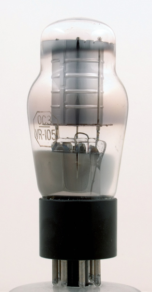 The VR105/30 here called a VR-105 is a cold cathode voltage stabiliser. The details of its operation are given in the type designation. This tube will stabilise the voltage across it to 105 Volts for output currents between 5 mA and 30 mA. To strike the tube the voltage must exceed 135 V.As with all such stabilisers the voltage will vary slightly with the current drawn. For this tube the stabilisation is 4 Volts across the current range.If used as a reference within a stabilised power supply the stabiliser tube would be run as close as possible in constant current mode, i.e. with a fixed load and controlling the voltage on the control grid of the amplifier within the power supply.