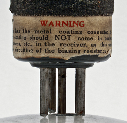 Here is another 244V with an interesting warning label. It reads: This valve has the metal coating connected to the centre pin. This coating should NOT come in contact with any earthed screens, etc., in the receiver, as this would result in short circuiting of the biasing resistance or battery.