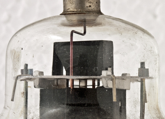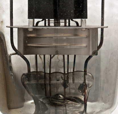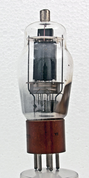 The anode connection to the top cap and the control grid heat radiator connected to the copper support rods.The classic envelope is 51 mm in diameter, and excluding the UX5 base pins is 126 mm tall.References: Data-sheet & 1040. Type 807 was first introduced in 1938. See also 1938 adverts. |