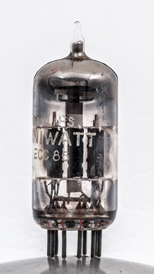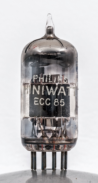 The ECC85 is the definitive double triode for the front end stages of FM radio receivers. It was designed specifically for the purpose and released in 1954. This exhibit by Philips has ate Miniwatt brand name.
