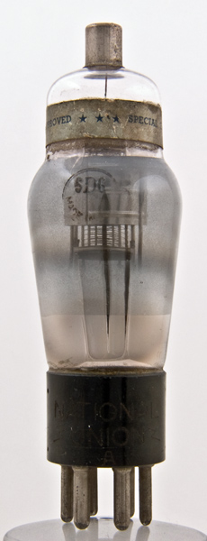The 6D6 (=6U7 on IO base) is a variable μ pentode for AGC controlled amplifiers at RF and IF in superhet radio receivers.Electrically the 6D6 (UX6 base) is identical to the Type 58 (UX6 base).The paper band around the top of the envelope is printed with the words - quality approved - special export test.