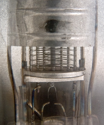 The construction is as a classic pentode. The three wire grids are helical and of different pitches. The suppressor is more open than the screen grid. The control grid will be wound with a variable pitch in order to generate the variable μ characteristic. Below the bottom mica the twisted and insulated heater wires can be seen entering the oxide coated cathode tube.The classic envelope is 38 mm in diameter, and excluding the UX6 base pins is 107 mm tall.References: Data-sheet, 1040 & 1043. Type 6D6 was first introduced in 1936. See also 1936 adverts. |