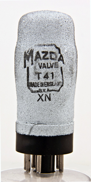 The T41 is an early thyratron and this exhibit is unused. The 6K25 is identical except for its 6.3 V heater.The thyratron is a special gas filled valve that at a given grid voltage rapidly moves into full conduction, when the gas ionises, thus acting as a switch. Under the correct circuit conditions this action can be made to generate ramps or pulses.These valves were used in early radar and television as ramp generators, and in the first computers as pulse generators.The T41 was used in the 1948 Murphy television receiver V114 as scan generators in both the frame and line circuits.